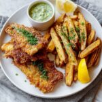 For a fun presentation, serve the fish and chips inside rustic parchment paper cones or on a wooden board lined with wax paper for that classic chip shop feel. Adding small bowls of different dipping sauces creates a playful, interactive dining experience everyone will enjoy.