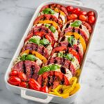 Start by arranging the sliced heirloom tomatoes, fresh mozzarella, salami slices, and fresh basil leaves in a repeating pattern within two neat lines in a 9×13 inch baking dish. This creates a beautiful foundation with layers of color and texture, making every bite a balanced melody of freshness and savory delight.