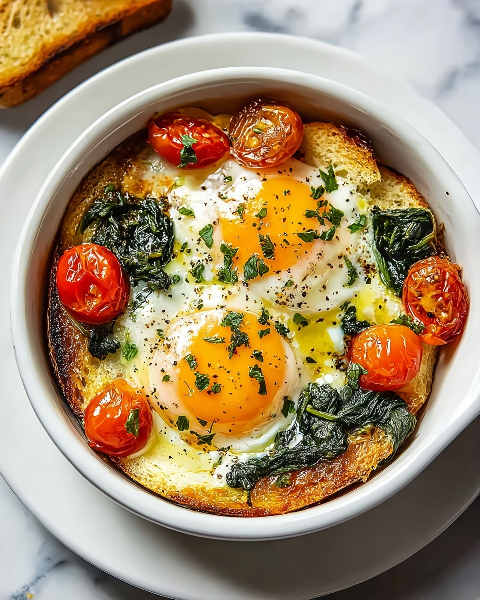 Baked Feta Eggs with Spinach and Tomatoes is a flavorful and wholesome breakfast or brunch dish that combines creamy baked feta cheese, vibrant cherry tomatoes, sautéed spinach, and perfectly baked eggs. This Mediterranean-inspired recipe is easy to prepare, uses fresh ingredients, and delivers a deliciously satisfying meal with a perfect balance of savory, tangy, and fresh flavors.