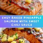 This Baked Pineapple Salmon recipe features tender, flaky salmon topped with a sweet and tangy pineapple glaze. The salmon is baked on a bed of pineapple slices and finished under the broiler to achieve a caramelized, slightly charred crust. Infused with flavors from sweet chili sauce, hoisin, garlic, and fresh lemon juice, this dish offers a perfect balance of savory and tropical notes, making for an easy yet impressive meal.