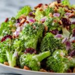 A refreshing and crunchy Broccoli Cranberry Salad featuring fresh broccoli, sweet dried cranberries, crunchy sunflower seeds, and a creamy honey-vinegar dressing. Perfect as a side dish or light snack, this salad combines vibrant flavors and textures with optional cheddar cheese and bacon for extra richness.