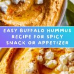 - Garnish and serve: Transfer the hummus to a serving bowl, garnish with crumbled blue cheese, chopped green onions, or a drizzle of extra buffalo sauce for added zing. Serve alongside pita chips, fresh vegetables, or crackers for dipping.