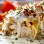 Preheat your oven to 375°F (190°C) and spread a thin layer of Alfredo sauce on the bottom of a 9×13-inch baking dish to prevent sticking and add moisture. Lay each cooked lasagna noodle flat, spoon the chicken mixture evenly along the center, then roll them up carefully. Arrange the roll-ups seam-side down in the baking dish in a neat row—it’s like creating little bundles of joy ready for their cheesy bath.