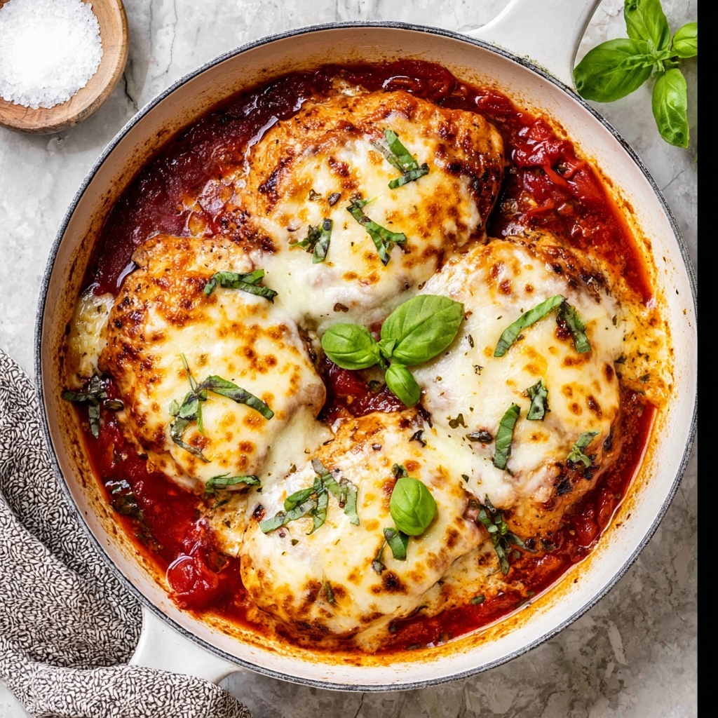 - Layer Chicken and Toppings: Return the chicken cutlets to the skillet, placing them on top of the sauce. Spoon additional marinara over each cutlet, then top each with two slices of mozzarella cheese, the remaining grated Parmesan, and sprinkle with sliced fresh basil leaves.