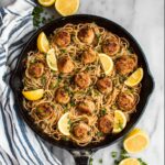 While the meatballs simmer, drop the whole wheat linguine into a large pot of salted boiling water. Cook until just shy of al dente then drain the pasta and immediately add it to the skillet with the meatballs and sauce. Let the pasta finish cooking right in the sauce, soaking up every bit of the lemony, buttery goodness.