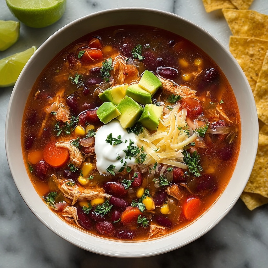 Garnishes make all the difference. Sprinkle shredded cheese so it melts invitingly on top, dollop creamy sour cream, scatter fresh cilantro, add slices of creamy avocado, and squeeze lime wedges for a zesty punch. A handful of crunchy tortilla chips adds texture and doubles as a perfect scoop. These simple extras turn a great soup into a show-stopping meal.