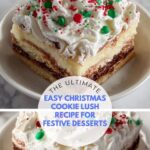 Christmas Cookie Lush is a festive layered dessert featuring a baked sugar cookie crust topped with a creamy cream cheese layer, rich vanilla pudding, and whipped topping, all decorated with colorful sprinkles and optional crushed peppermint candies for a holiday touch. This no-bake layered dessert combines buttery, sweet, and creamy textures, perfect for holiday celebrations.