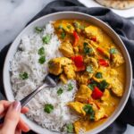 This vibrant Coconut Chicken Curry is a rich and flavorful dish combining tender chicken pieces simmered in a fragrant sauce made with coconut milk, red and yellow curry pastes, ginger, garlic, and coriander. Enhanced with the sweetness of brown sugar and the tang of lime, it offers a perfect balance of creamy, spicy, and fresh flavors. Served best over steamed rice or with warm naan, garnished with fresh herbs and crunchy nuts, it’s an easy and comforting meal perfect for any weeknight dinner.