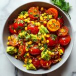 A fresh and vibrant Corn Tomato Avocado Salad combining sweet corn, creamy avocado, and juicy tomatoes tossed with red onion, cilantro, and a zesty lime-olive oil dressing. Perfect as a light side dish or a healthy snack, this no-cook recipe comes together quickly and highlights summer flavors.