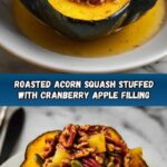 A cozy and festive dish featuring roasted acorn squash halves filled with a warm, spiced apple and cranberry mixture, topped with a sweet and crunchy maple-glazed pecan and pepita topping. Perfect as a comforting side or vegetarian main during fall and holiday meals.