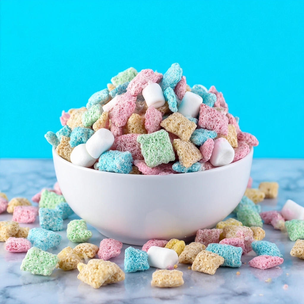 Easter Bunny Puppy Chow with Pastel Colors and Mini Marshmallows Recipe