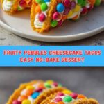 These Delicious Fruity Pebbles Cheesecake Tacos are a fun and colorful dessert featuring crunchy fruity cereal shells filled with a creamy, sweet cheesecake filling. Perfect for parties or a playful treat, these no-bake taco-shaped desserts combine fruity flavors with smooth cream cheese and whipped cream for a delightful bite every time.