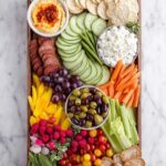 Time to get creative! Neatly place the fresh vegetables like cucumbers, snap peas, carrots, radishes, celery, and cherry tomatoes around your dips and olives. Then, artfully layer slices of spicy pepperoni and salami alongside chunks or wedges of feta and your choice of cheese. Add clusters of grapes, raspberries, and slices of peach to bring bursts of sweetness and color. Finally, tuck in pita bread pieces, crackers, and mixed nuts to fill any gaps, ensuring the board is abundant and inviting.