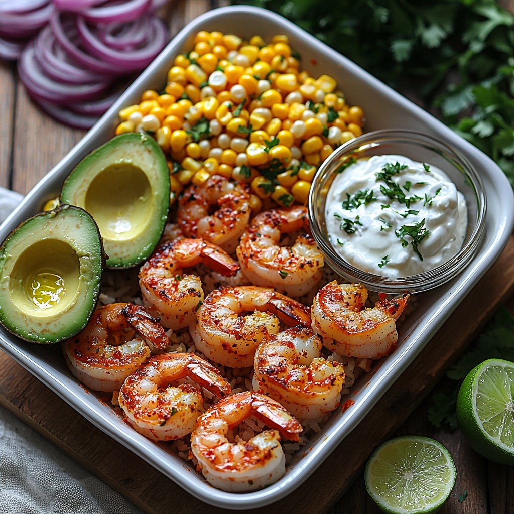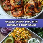 This Grilled Shrimp Bowl features perfectly seasoned and grilled shrimp served over a base of rice, quinoa, or greens, accompanied by a fresh corn salsa, creamy avocado mash, and a smoky chipotle sauce. A vibrant, nutritious, and flavorful dish that comes together quickly, perfect for a wholesome weeknight dinner or a light lunch.