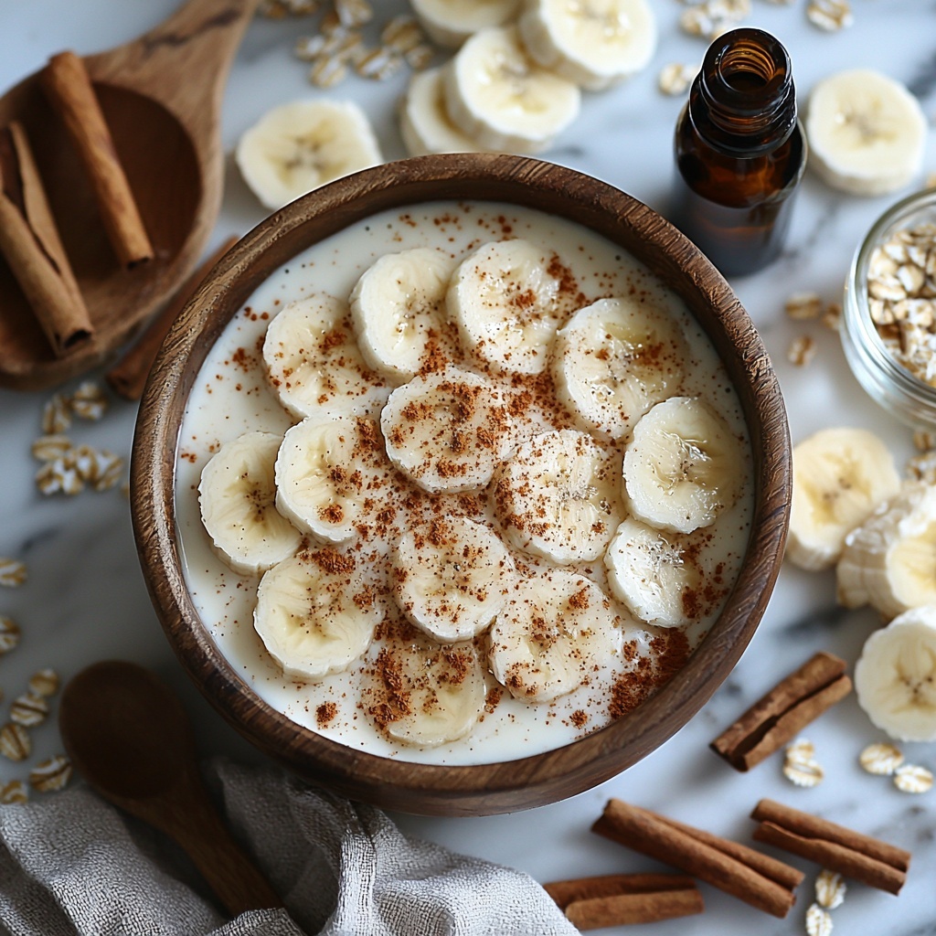 - Combine Ingredients: Place the frozen banana (or fresh banana with ice cubes), rolled oats, cinnamon, milk, and vanilla Greek yogurt into a blender.