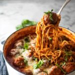 Remove the lid, add the dried spaghetti, and use tongs to gently push the pasta beneath the surface of the broth as it softens. Once submerged, carefully nestle in the meatballs. Let everything cook together for about 12 minutes until the spaghetti is al dente, and the meatballs are cooked through. This finishing step brings everything together in one pot of pure comfort.