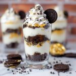 - Garnish: Sprinkle mini chocolate chips generously over the top of each parfait and place an Oreo cookie on the side of each dish as an attractive garnish.