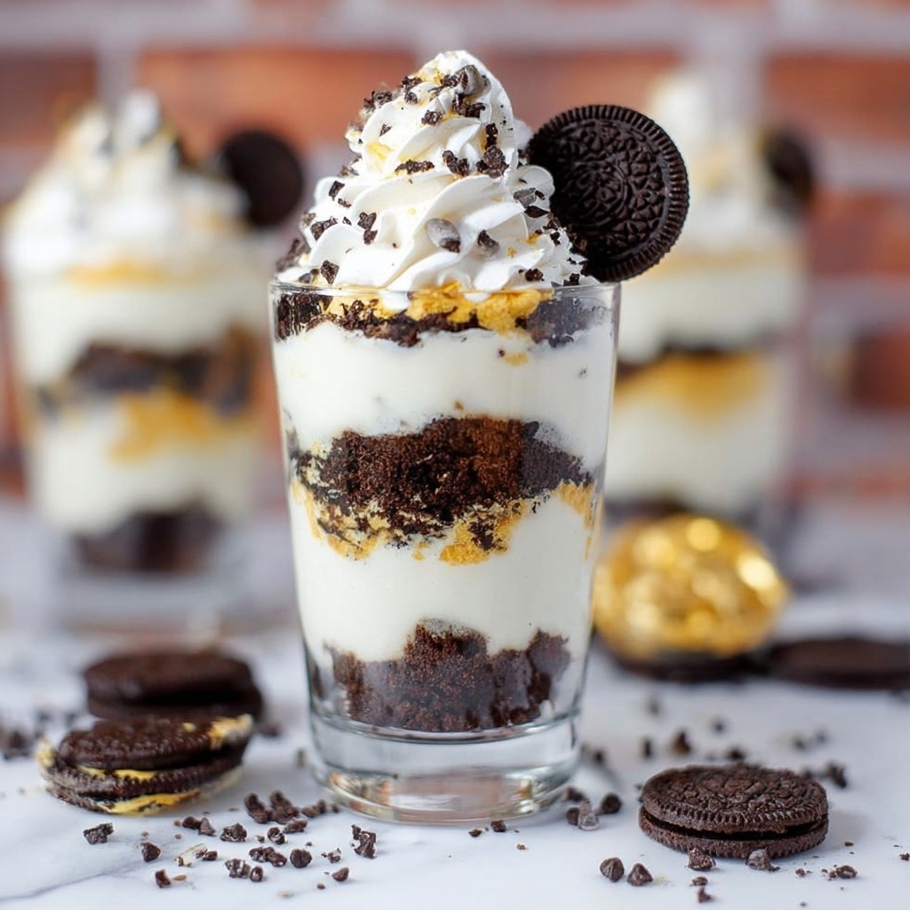 Sprinkle mini chocolate chips over the top of each parfait and tuck a whole Oreo cookie onto the side for an elegant finish. Chill the parfaits in the refrigerator for at least four hours, but overnight chilling is ideal for the best texture and flavor harmony.