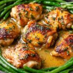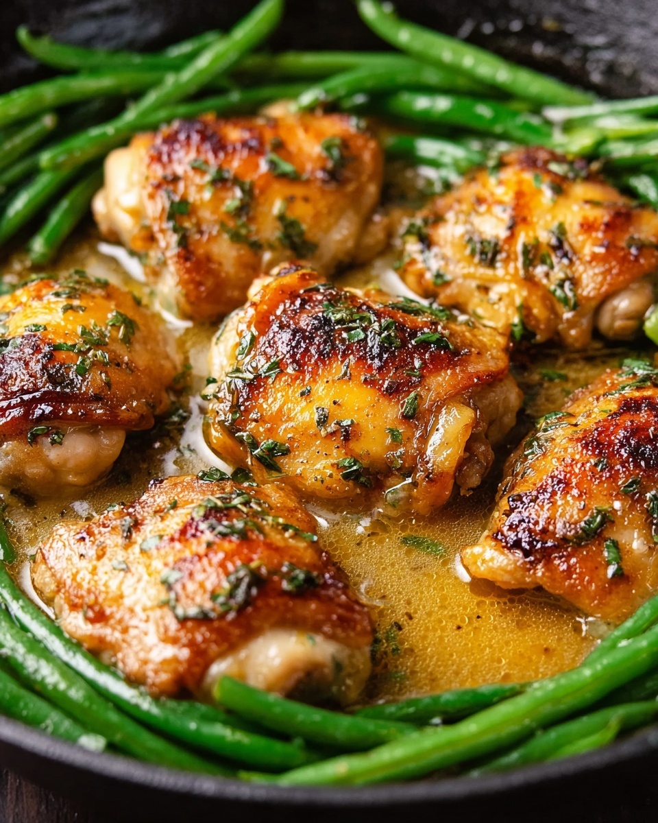 For an elegant dinner, serve the chicken thighs whole on a white platter topped with parsley and lemon slices. Alternatively, slice the chicken and arrange alongside the green beans for easy plating. Consider serving it family-style right from the skillet for a cozy, rustic vibe that invites everyone to dive in together.
