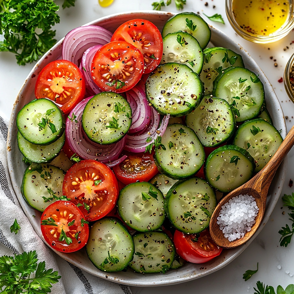 This vibrant marinated salad combines crisp cucumbers, juicy tomatoes, and sharp red onions, all soaked in a tangy vinaigrette made with vinegar, olive oil, and a touch of sweetness. Fresh parsley and dried oregano round out the flavors, making it a refreshing, easy-to-prepare side dish perfect for warm weather or as a complement to grilled meats and sandwiches.