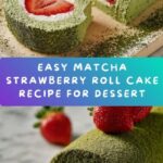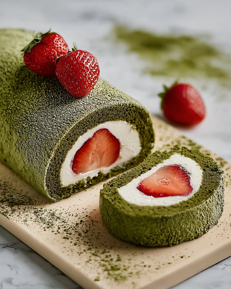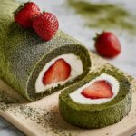 A delicate and visually stunning Matcha & Strawberry Roulade featuring a light matcha-flavored sponge cake rolled with fluffy whipped cream and fresh strawberries. This elegant dessert balances the earthy notes of matcha with the sweetness of strawberries, perfect for teatime or special occasions.