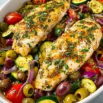 This Mediterranean Baked Fish is a vibrant and healthy dish featuring delicate fish fillets baked with a flavorful blend of fresh herbs, garlic, lemon, sweet chili sauce, and a colorful mix of cherry tomatoes, olives, onion, and zucchini. Perfect for a quick, wholesome weeknight meal that brings the bright flavors of the Mediterranean to your table.