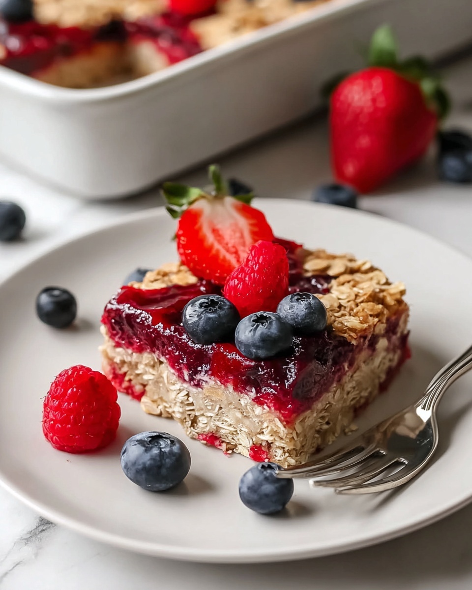 Add a fresh twist to your baked oatmeal by topping it with a dollop of Greek yogurt, a handful of toasted nuts for crunch, or an extra scattering of fresh mixed berries. These garnishes bring additional texture, creaminess, and brightness that complement the warm flavors.