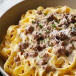This One-Pot Creamy Beef and Garlic Butter Pasta is a hearty and comforting dish featuring ground beef simmered with garlic, onions, and Italian seasoning in a creamy Parmesan sauce. Perfect for a quick weeknight dinner, this recipe combines tender pasta cooked right in the flavorful beef broth and cream mixture for an easy and delicious all-in-one meal.