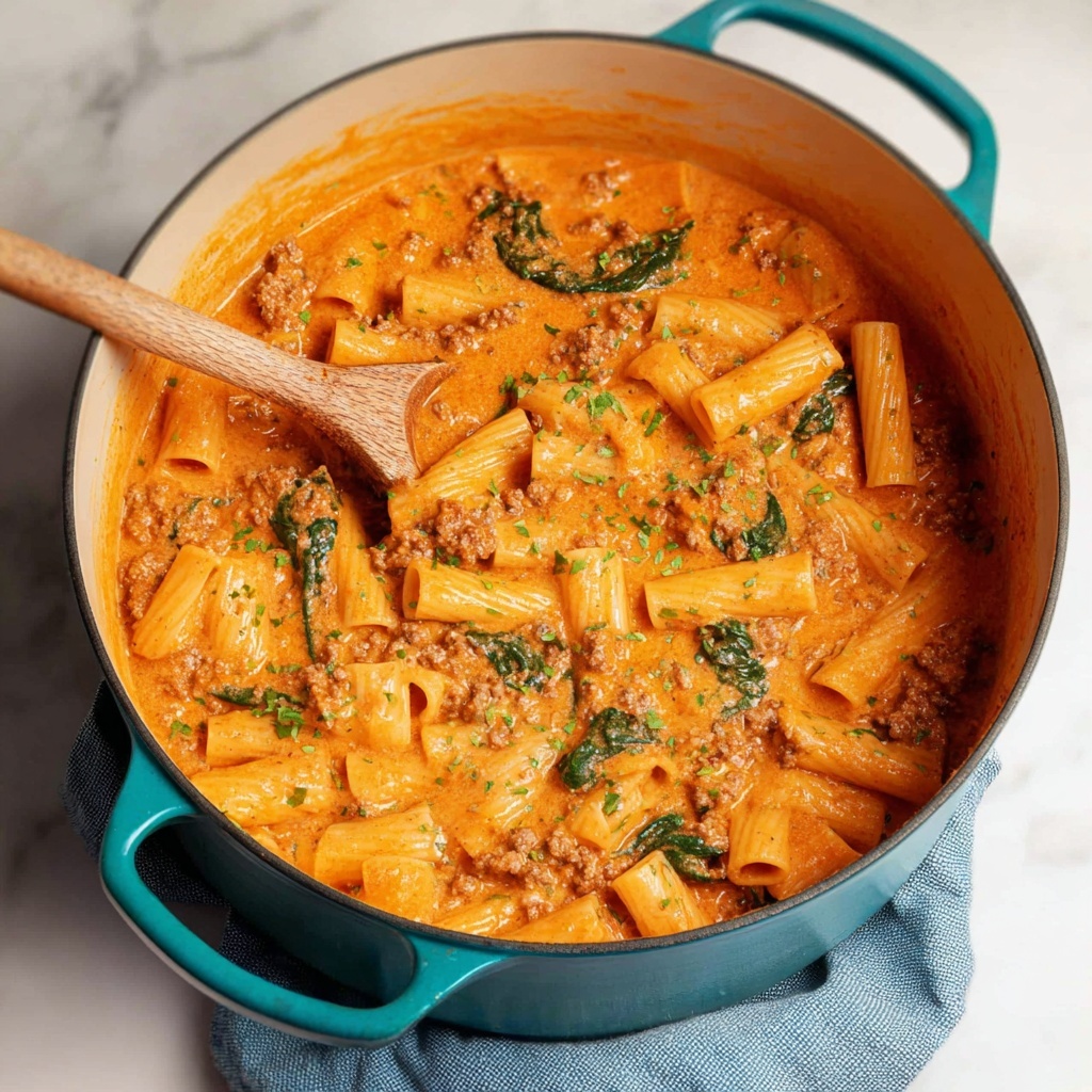 This One Pot Sausage Rigatoni is a hearty and comforting Italian-inspired dish combining savory Italian sausage, tender rigatoni pasta, and fresh baby spinach all cooked together in a creamy tomato sauce. Prepared in a single pot, this recipe simplifies dinner time while delivering rich, satisfying flavors perfect for any weeknight meal.
