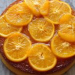 8. Cool and Invert Cake: Let the cake cool in the pan for about 10 minutes. Run a knife carefully around the edges to loosen it, then invert the cake onto a serving plate, revealing the glossy caramelized orange topping. Serve warm or at room temperature.