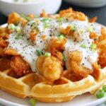 6. Serve: Place a waffle on each plate, top with the oven-fried chicken, and generously ladle white gravy over the chicken. Garnish with chopped scallions or chives for a fresh, vibrant finish.