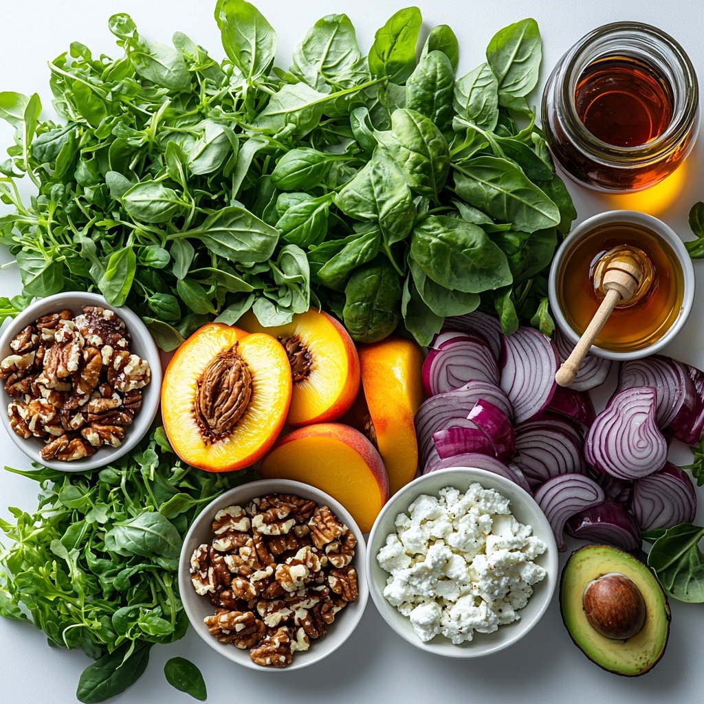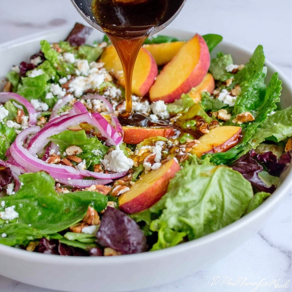 - Assemble and Serve: Just before serving, add the sliced peaches and avocado to the salad bowl. Pour the prepared dressing over the salad according to your preference for coating. Toss gently but thoroughly until all ingredients are evenly mixed and dressed. Adjust seasoning by adding salt and freshly ground black pepper to taste. Serve immediately for best flavor and texture.