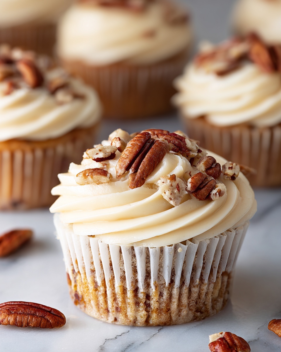 Keep leftover cupcakes in an airtight container at room temperature for up to two days. This will preserve their moist crumb and crunchy pecans without drying out. If your kitchen is warm, refrigeration is fine but let them come to room temperature before eating.