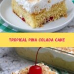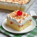 This Pina Colada Cake is a tropical-inspired dessert that combines the sweet flavors of pineapple, coconut, and a hint of rum in a moist, fluffy cake. Perfect for summer gatherings or any time you crave a taste of the islands, this cake features a pineapple cake base infused with coconut milk and enhanced by diced cherries. The cake is then topped with a rich coconut-milk and sweetened condensed milk mixture and finished with toasted coconut for a delightful crunch.