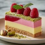 - Garnish and Serve: Carefully remove the entremet from the springform pan. Decorate the top with crushed pistachios and fresh raspberries. Slice with a warm knife for clean cuts and enjoy!