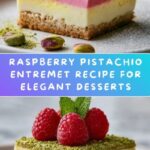 A sophisticated Raspberry Pistachio Entremet featuring delicate pistachio flour cake layers, a tangy raspberry jelly, creamy pistachio mousse, and a smooth raspberry glaze, all elegantly garnished with crushed pistachios and fresh raspberries. This layered dessert combines nutty, fruity, and creamy textures in a visually stunning presentation perfect for special occasions.