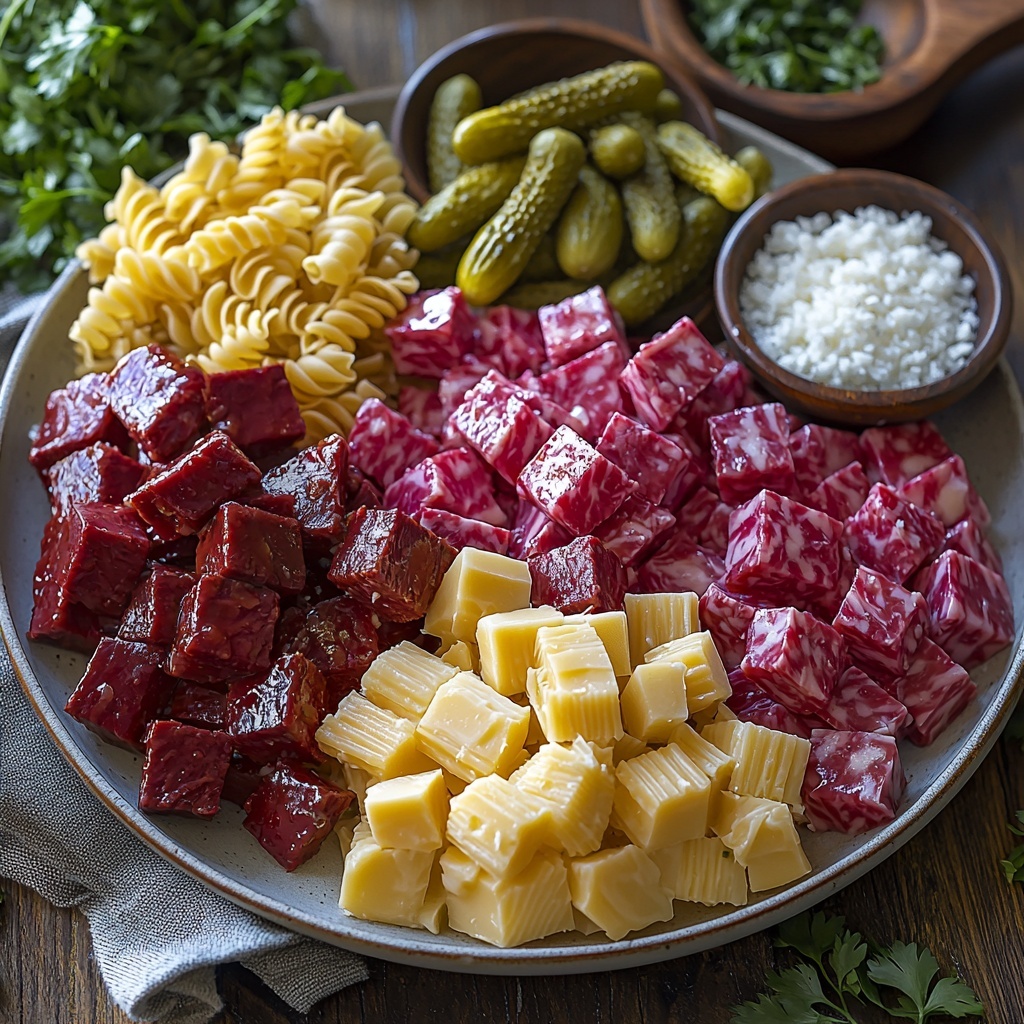 Start by cooking your pasta according to the package directions until it’s al dente—firm but tender. Drain it well and rinse under cold water to cool and stop the cooking process. Meanwhile, slice or cube your corned beef into bite-sized pieces. Whether you have deli corned beef or homemade, this step sets the stage for flavor-packed bites throughout the salad.