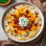 This Rich Creamy Baked Potato Soup is a comforting and hearty dish made with roasted russet potatoes, sautéed onions, and garlic, blended into a smooth, creamy soup with the addition of heavy cream and sour cream. Enhanced with crispy bacon and sharp cheddar cheese, it’s perfect for a cozy meal and garnished with fresh chives or green onions for a burst of color and flavor.