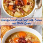 - Add sauerkraut, beans, and seasonings: Add the triple-rinsed and drained sauerkraut, half of the cooked bacon (reserve the rest for garnish), the white beans with their juice, and 1 bay leaf to the soup. Continue to cook over low heat for about 10 minutes, or until the potatoes are tender.