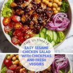 A vibrant and nutritious Sesame Chicken and Chickpea Salad featuring grilled marinated chicken breast, crisp mixed greens, juicy cherry tomatoes, and chickpeas. Tossed with a zesty ginger and garlic dressing and finished with toasted sesame seeds for a delightful crunch. Perfect for a wholesome, protein-packed meal that’s fresh and flavorful.