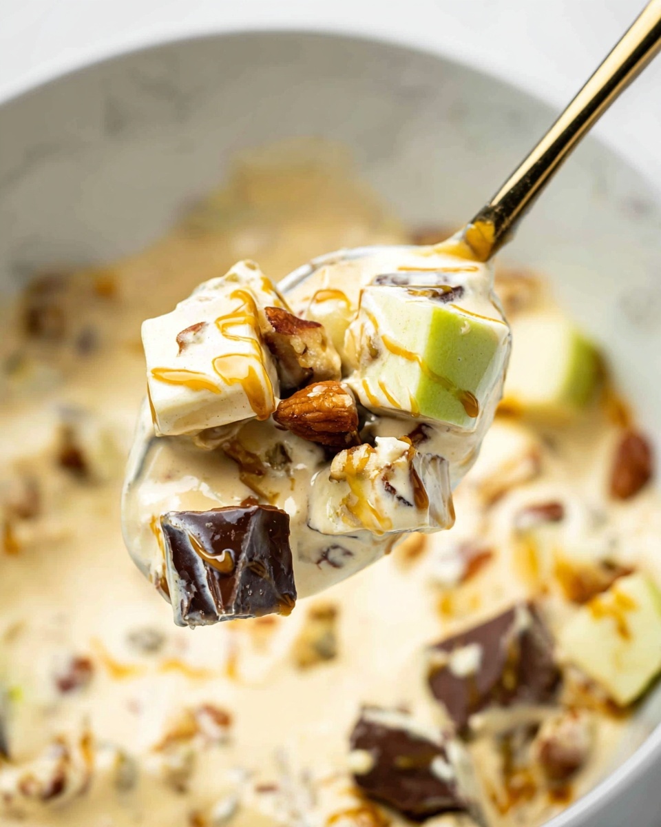 Snickers Salad is a creamy, sweet dessert salad combining the richness of instant vanilla pudding and Cool Whip with crunchy, bite-sized pieces of Snickers bars and fresh Granny Smith apples. Finished with a drizzle of caramel sauce, this easy-to-make, chilled treat is perfect for gatherings and sweet cravings.