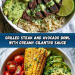 - Add Steak and Sauce: Top the bowls with the thinly sliced grilled steak and drizzle generously with the creamy cilantro sauce for a burst of flavor.
