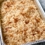 Distribute the rinsed rice evenly across the bottom of your prepared baking dish. This ensures that every grain gets equal exposure to the flavorful liquids you’re about to add.