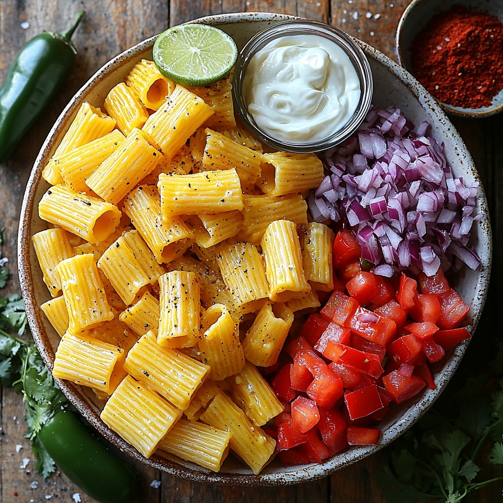 While the pasta is cooling, whisk together the mayonnaise, sour cream, lime juice, chili powder, salt, and pepper until smooth. This combination creates a luscious, tangy dressing that perfectly marries the sweetness of the corn with the subtle heat of jalapenos and chili powder, making every bite delightfully flavorful.
