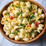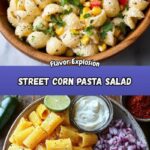 A vibrant and flavorful Street Corn Pasta Salad combining tender pasta with sweet corn, zesty lime dressing, and a hint of spice for a refreshing and satisfying side dish or light meal.
