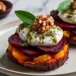 This vibrant and comforting dish features roasted sweet potato rounds topped with creamy burrata cheese, roasted beets, and a flavorful walnut sage pesto. Perfect as an elegant appetizer or light meal, it combines earthy roasted vegetables with fresh, nutty pesto and luscious cheese for a balanced and visually appealing plate.