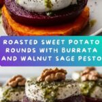 - Assemble the Dish: Arrange the roasted sweet potato rounds on a serving platter. Place a spoonful of the roasted beets on each round, followed by a piece of burrata cheese. Drizzle the walnut sage pesto generously over the top.