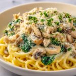 Turkey Tetrazzini with Spinach is a comforting baked pasta dish featuring tender turkey, fresh spinach, and a creamy mushroom sauce, topped with cheesy goodness and baked to golden perfection. Perfect for using up leftover turkey or chicken, this recipe combines rich flavors and a hearty texture for a satisfying meal.