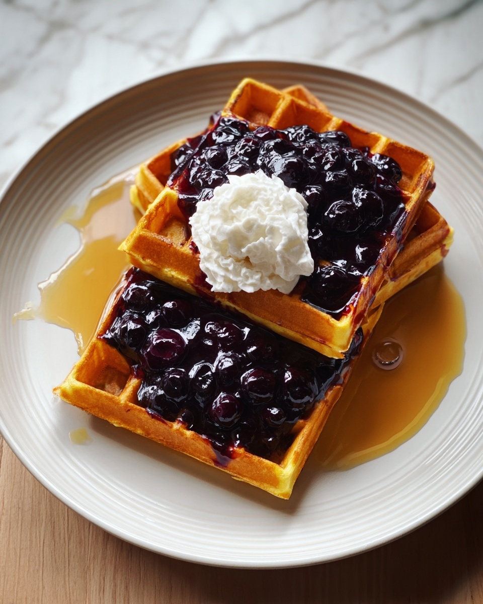 Place fresh blueberries in a small saucepan with a splash of water or a squeeze of lemon juice. Simmer gently until the berries soften and the mixture thickens into a luscious compote with natural sweetness and just a hint of tartness. This topping is what elevates the waffles to something truly special.