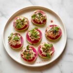 These Watermelon Radish Bites are delightful, colorful canapés perfect for parties or light snacks. Thinly sliced watermelon radish rounds serve as a crisp and peppery base, topped with a creamy tuna mixture seasoned with sriracha and kosher salt, and garnished with microgreens for a fresh finish.